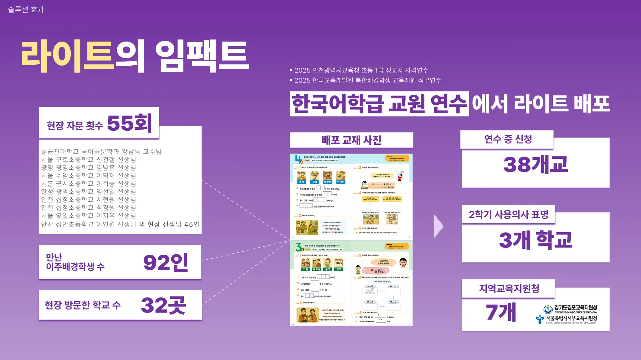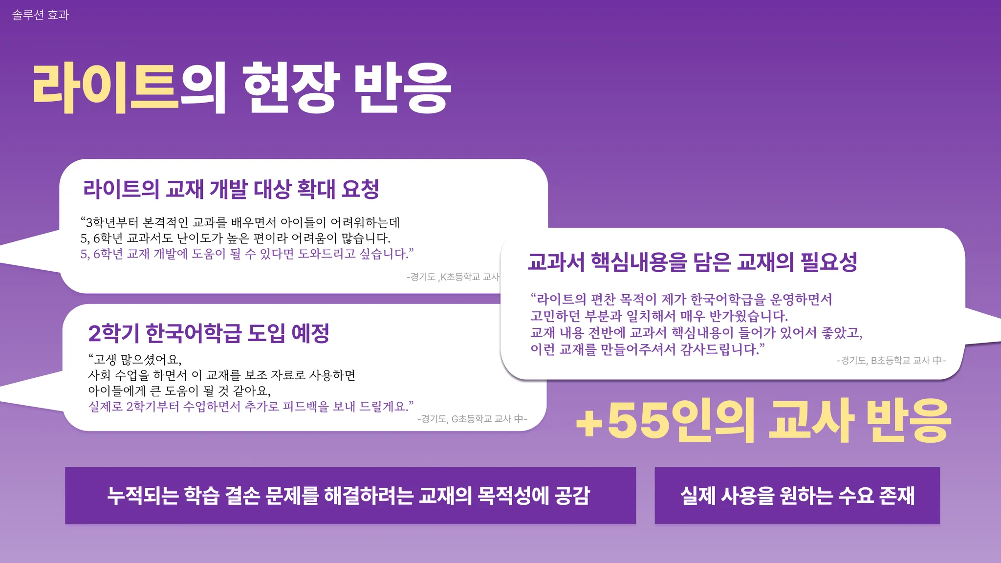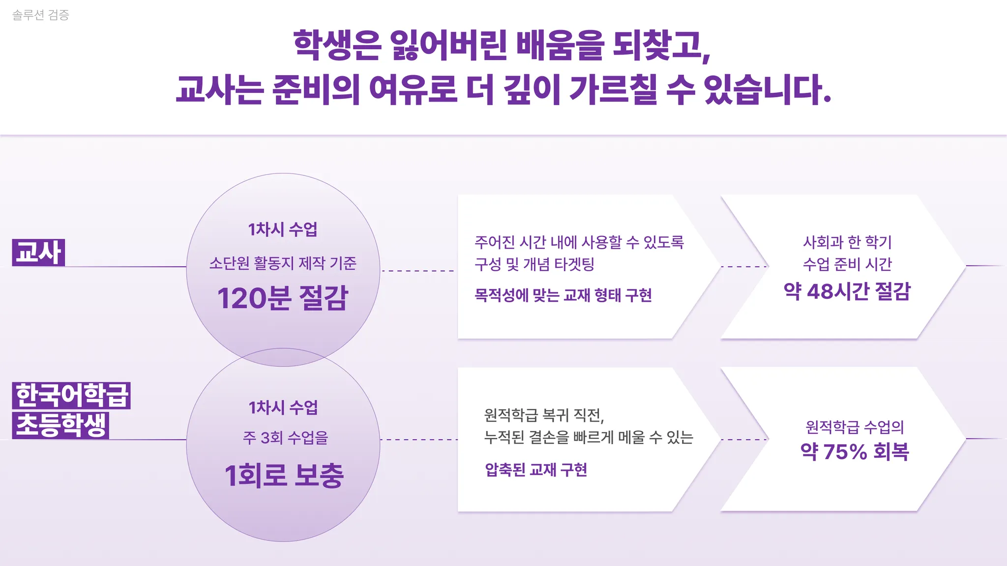 향후 솔루션을 도입할 학교에서 실제 사용 사례를 축적하고, 교사와 학생 모두의 피드백을 통해 원적학급 교과 적응도가 개선되는지를 검증하며, 솔루션의 효과를 더욱 구체적으로 입증해 나가겠습니다.
