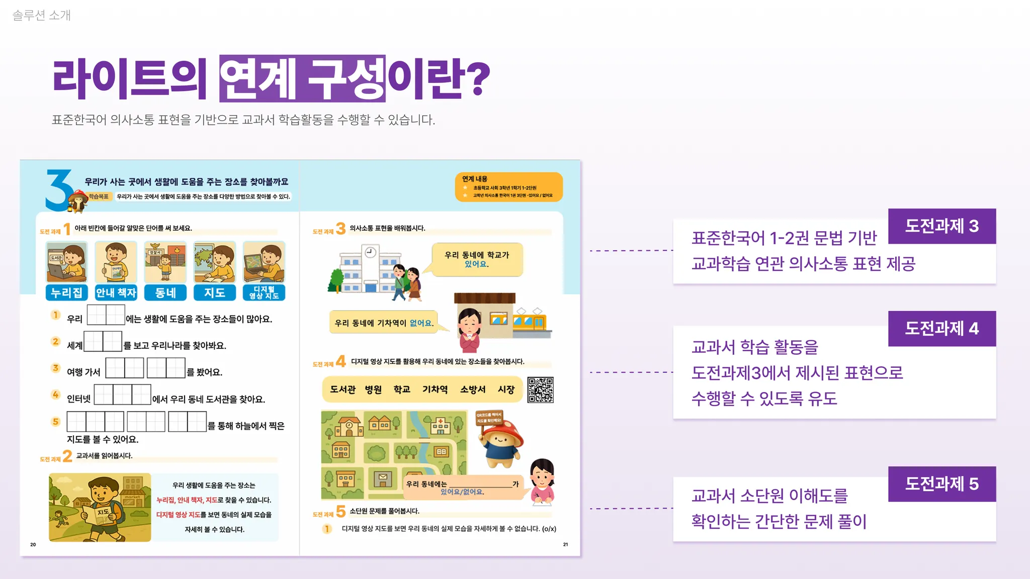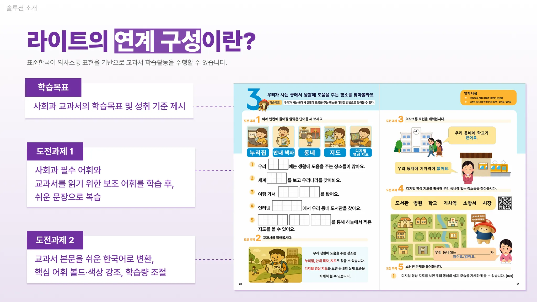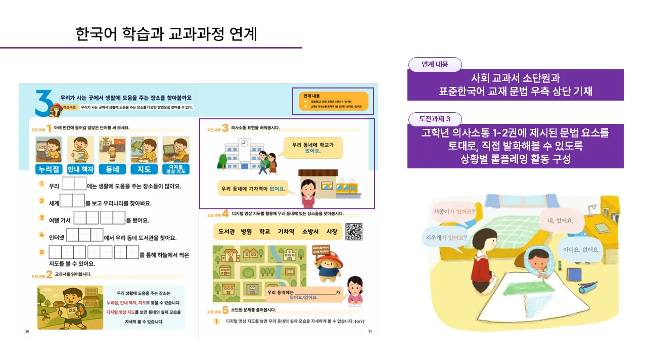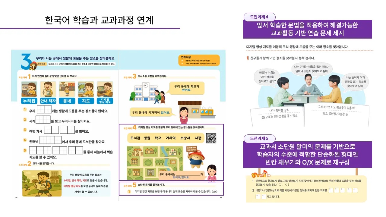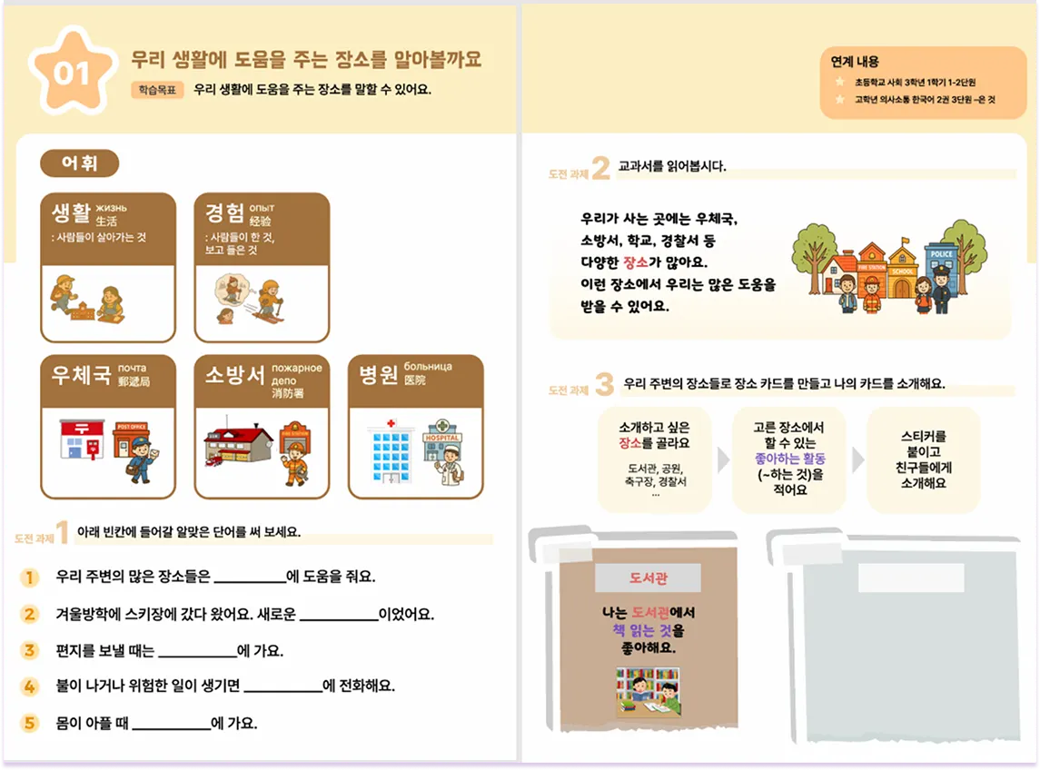 단순한 언어학습 자료가 아닌, 교과 핵심어휘, 본문 이해, 활동을 통합 설계하여 학습자의 수업 참여도와 자신감 향상을 도모합니다.