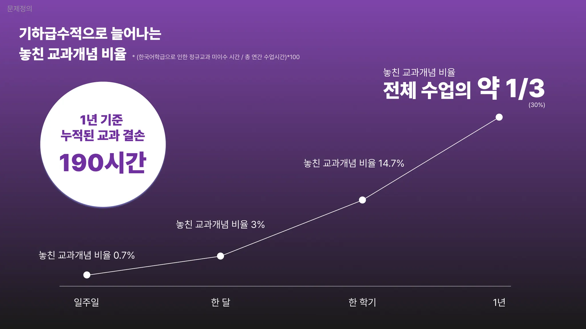 따라서 우리의 최종 목표는 솔루션을 통해 학생이 원적학급 복귀 직전 이전에 빠졌던 교과 내용을 학습하고, 실제 수업에서 이전보다 원활하게 적응하는 모습을 확인하는 것입니다. 이는 곧 문제 정의의 궁극적 목표인 ‘중도입국 학생의 학교 적응’으로 이어집니다.
