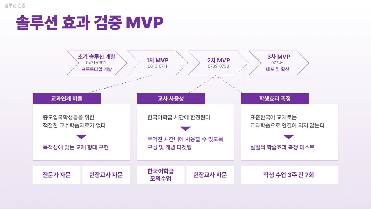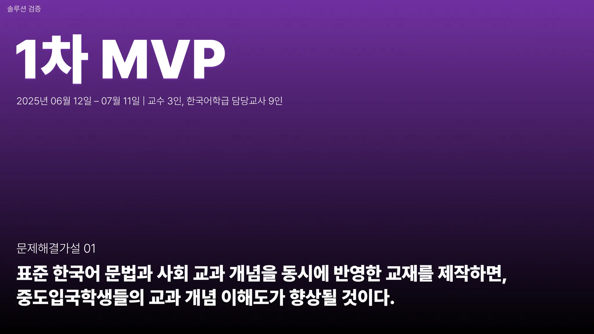 MVP 테스트를 교사·교수 자문과 중도입국 초등학생 대상 수업 시연이라는 두 범주로 나누어 진행하였습니다.