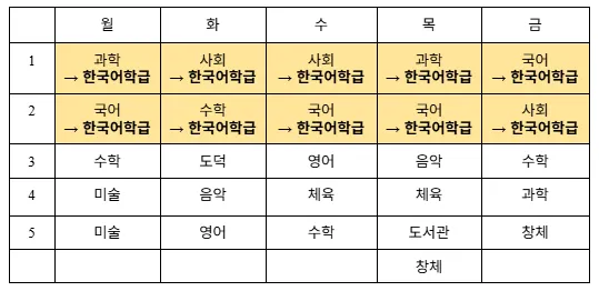 좌측 시간표와 같이 하루 약 2시간씩 언어의존도가 높은 과목 시간에는