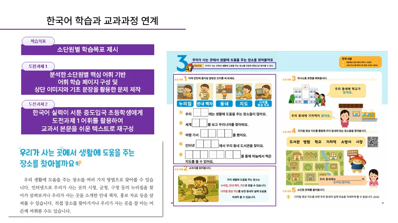 표준 한국어 문법과 사회 교과 개념을 동시에 반영한 교재를 제작하면,