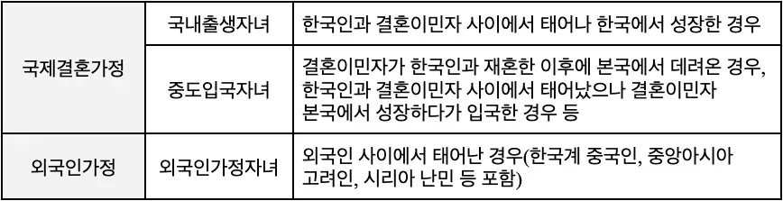 교육부(2025)에서는 학생 본인 또는 부모가 외국 국적이나 외국 국적을 가졌던 적이 있는 학생을 이주배경학생이라고 부른다.