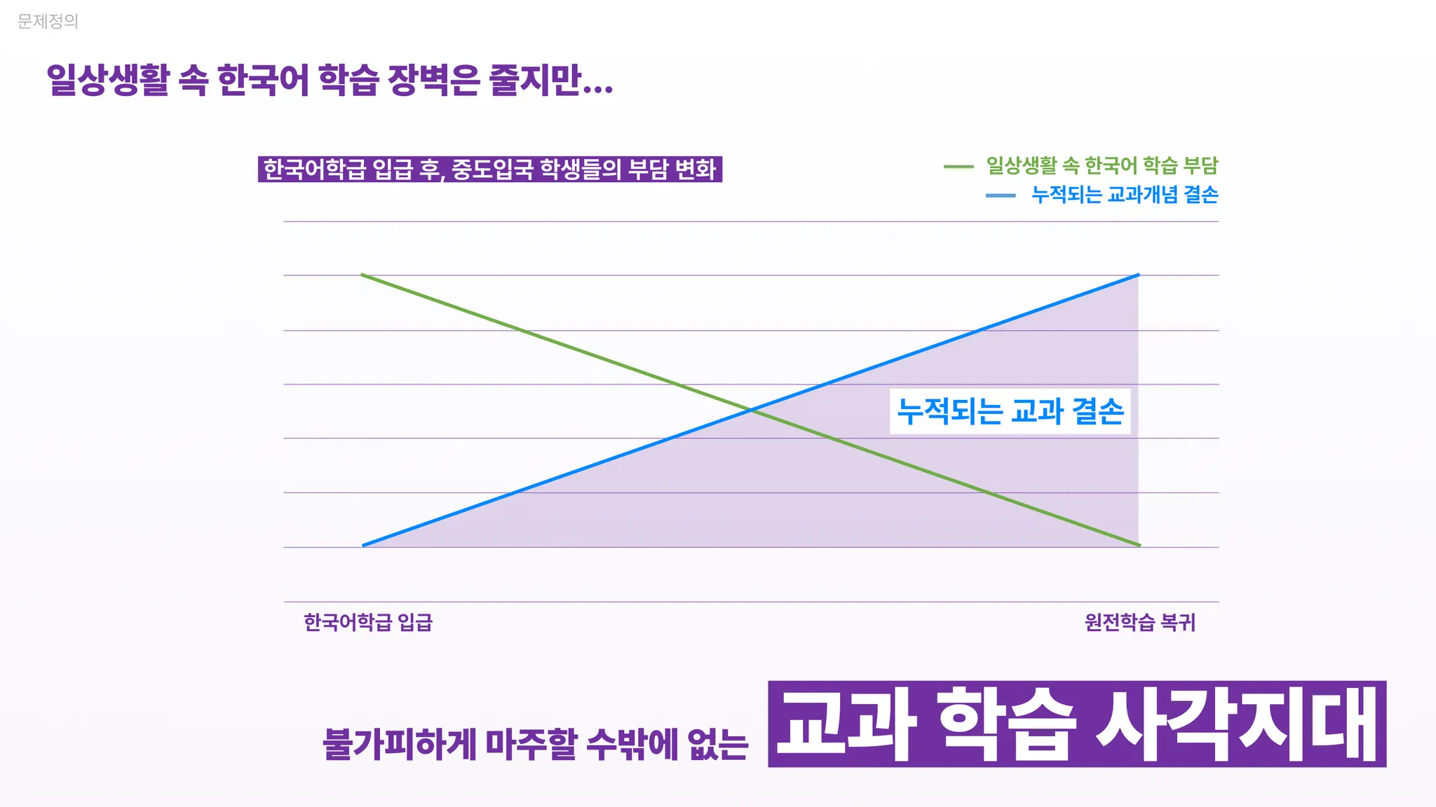 중도입국 후 한국어 학습에 집중하는 동안 놓친 교과 개념들이 제대로 해소되지 않아, 이후에도 지속적인 문제가 되고 있었습니다.