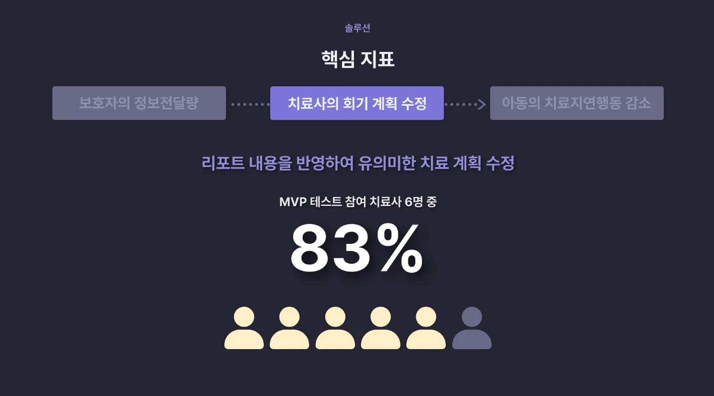 MVP 테스트에 참여한 치료사 6인 중 5인, 즉 83%의 치료사가 해당 정보를 바탕으로 임상에서 유의미한 치료 계획 수정했다고 응답하였다.