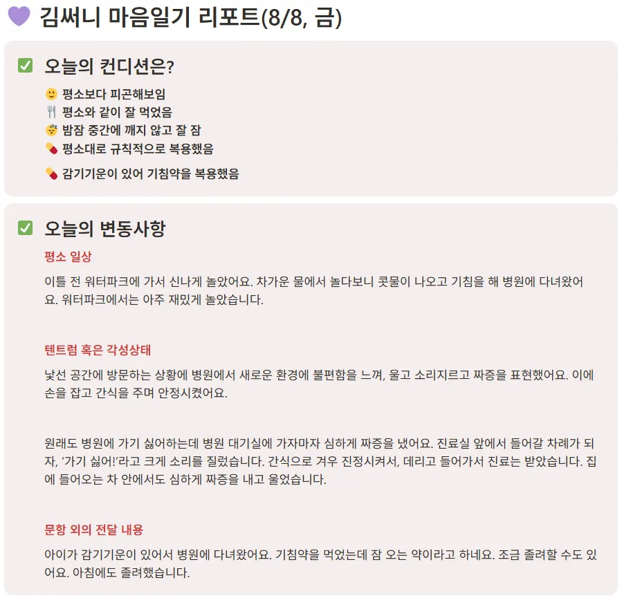 하나의 채팅방에 여러 아이의 리포트가 오니, 아이를 상태를 누적해서 확인하지 못해서 아쉬워요.