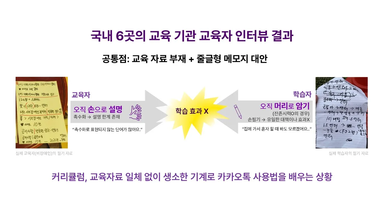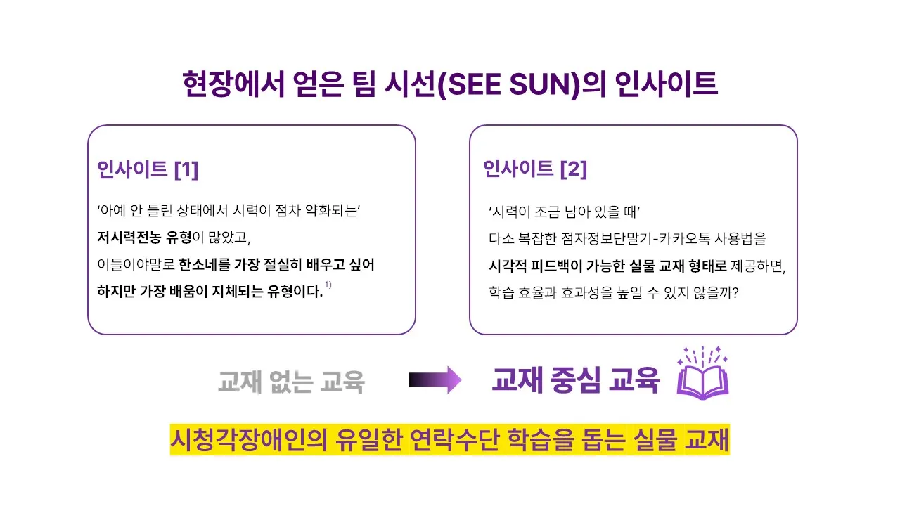 교육 자원의 부족, 소통 방식의 제약, 교육자 역량 격차라는 문제를 구조화하고, 이를 개선할 수 있는 구체적 솔루션을 제시했다는 점에서 의의가 있습니다. 이는 단순한 학습 효율 향상을 넘어, 시청각장애인의 교육권 보장과 사회적 포용성 확대에 기여하는 발판이 됩니다.