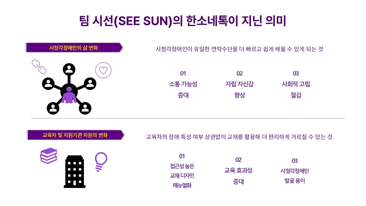따라서 팀 시선(SEE SUN)의 여정은 계속될 것입니다. 시청각장애인이 세상과 연결되길 함께 꿈꾸며 계속해서 ‘한소네톡’을 다음과 같이 이어갈 계획입니다.