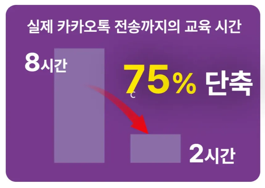 실제 측정 결과, 카카오톡 전송까지 걸리는 교육 시간이 기존 8시간에서 2시간으로 평균 75% 단축되었으며,