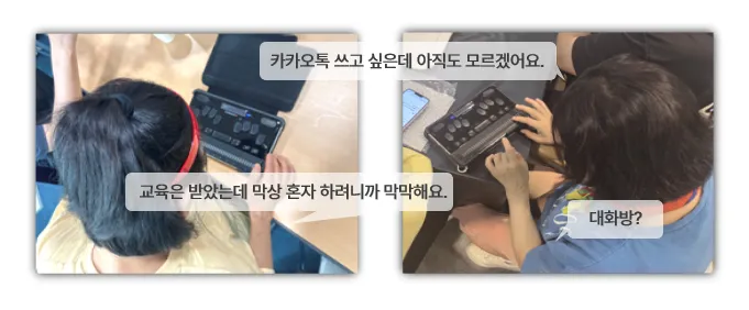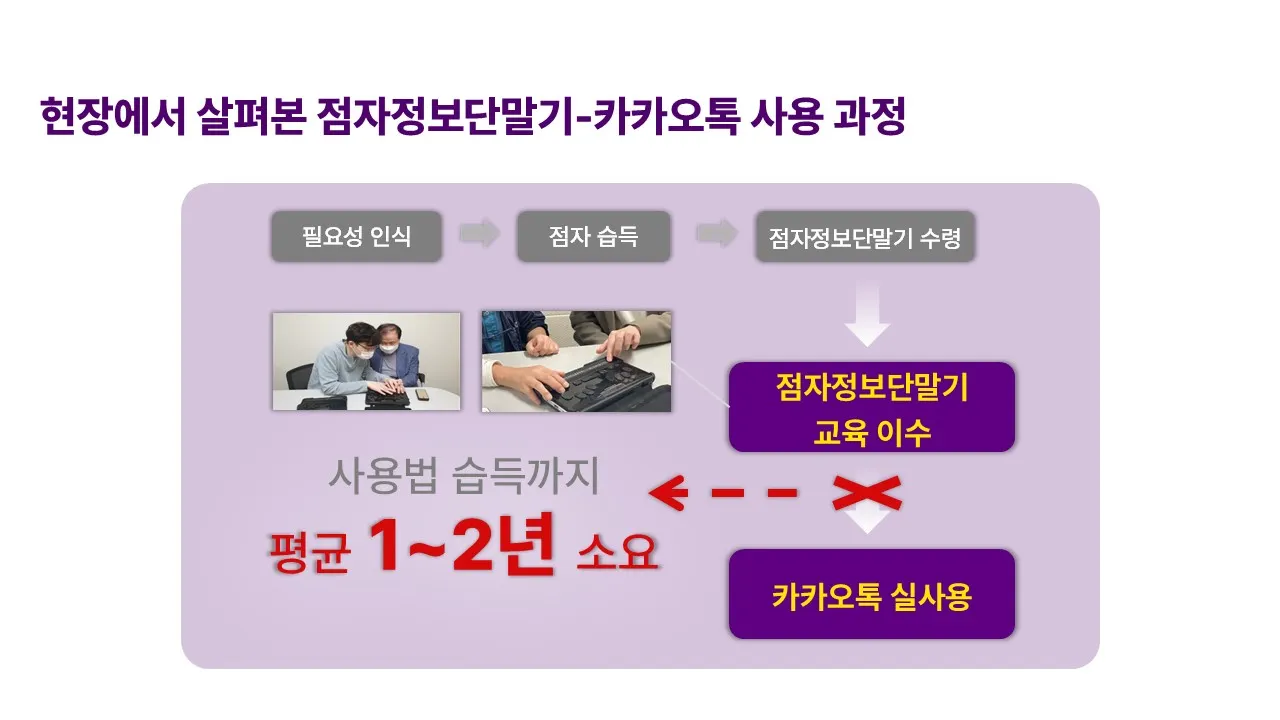 그렇게 시선은 ‘시청각장애인의 유일한 연락수단인 점자정보단말기-카카오톡 사용법 습득의 어려움’에 시선을 모으게 되었습니다.