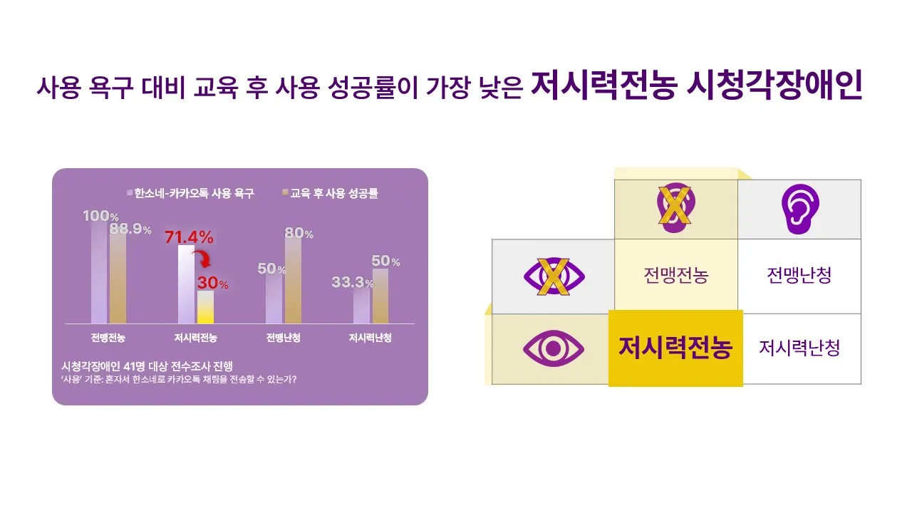 비체계적인 교육으로 인해 점자정보단말기로 카카오톡 사용 방법을 교육 받은 저시력전농 시청각장애인의 70%는 실사용을 하지 못한다.