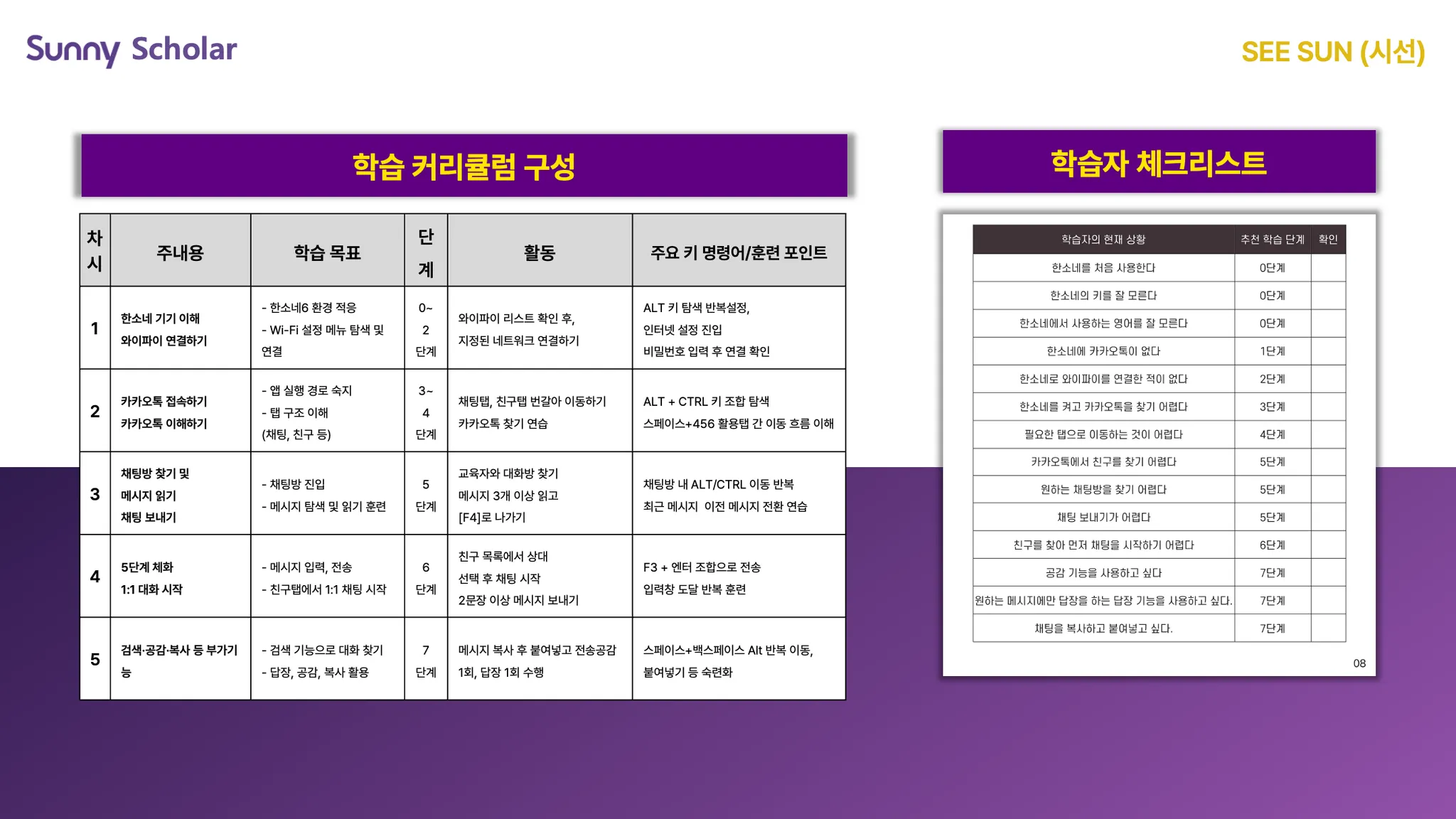 보편화된 커리큘럼을 구성하여, 학습자의 한소네 사용 능력에 맞춰 바로 교육을 진행할 수 있도록 하며 이를 적용할 수 있도록 안내하는 설명서 함께 제공