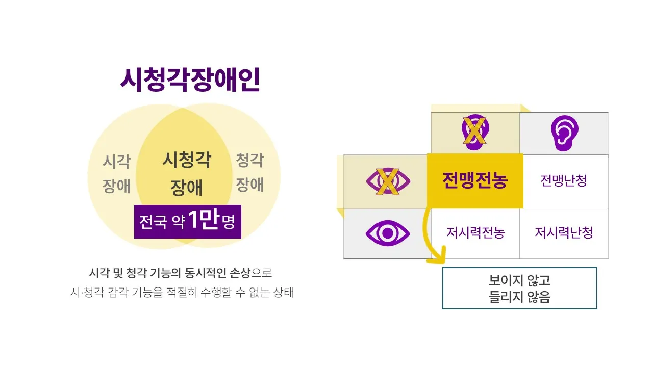 시청각장애인은 시각 및 청각 기능의 동시적인 손상으로 시각과 청각의 감각 기능을 적절히 수행할 수 없는 사람으로, 2020년 보건복지부의 시청각장애인 실태조사에 따르면 약 1만 명이 있을 것이라고 추정되고 있습니다.