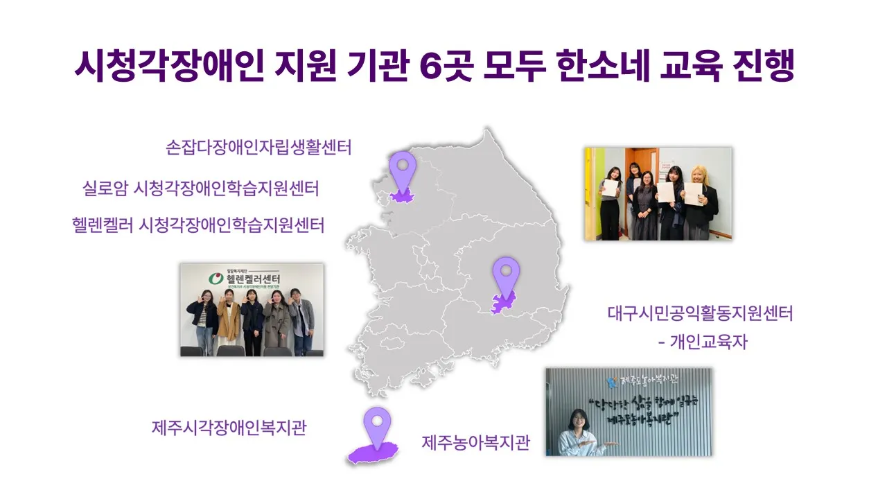팀 시선(SEE SUN)은 2개월에 걸쳐 서울을 시작으로 대구, 제주를 오가며 시청각장애인 지원 기관과 인터뷰를 진행한 결과, 다행히 시청각장애인을 지원하는 기관 모두 한소네 교육을 진행하고 있음을 확인할 수 있었습니다.