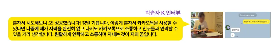 “혼자서 시도해보니 오! 성공했습니다! 정말 기쁩니다. 이렇게 혼자서 카카오톡을 사용할 수 있다면 나중에 제가 시력을 완전히 잃고 나서도 카카오톡으로 소통하고 친구들과 연락할 수 있을 거라 생각합니다. 원활하게 연락하고 소통하며 지내는 것이 저의 꿈입니다”
