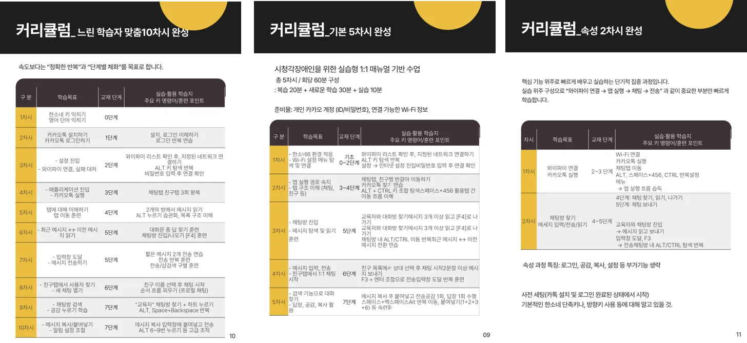 즉, 시청각장애인의 유일한 소통 수단인 점자정보단말기를 중심으로 체계적인 커리큘럼과 실물 교재를 도입하면 학습 지속성과 실사용률을 높일 수 있다는 가설을 세웠습니다.