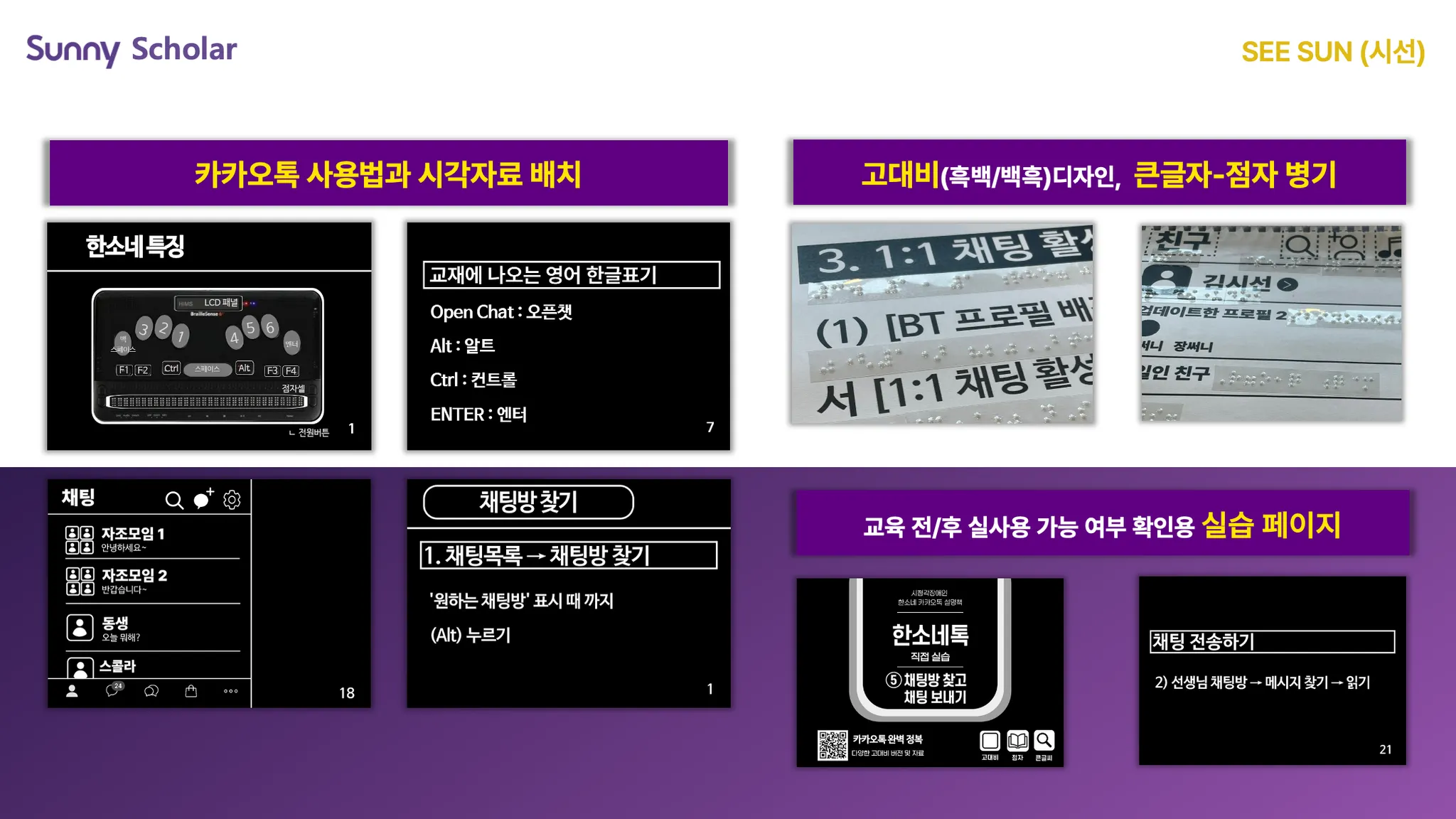 점자정보단말기를 통한 카카오톡 교육 현장에서 저시력전농 시청각장애인을 위한 학습 교재는 물론 카카오톡 교육을 위한 교재 자체가 존재하지 않았습니다.